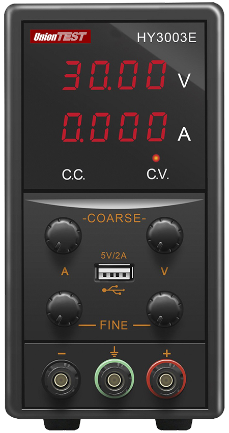 UnionTest HY3003E – импульсный источник питания, позволяющий получать регулируемое, точное и стабильное постоянное напряжение или постоянный ток. Две пары регуляторов грубой и точной настройки обеспечивают точность установки, а цифровые четырёхразрядные светодиодные индикаторы тока и напряжения упрощают считывание параметров выхода. На лицевой панели расположен USB выход на 5 В/2 А.