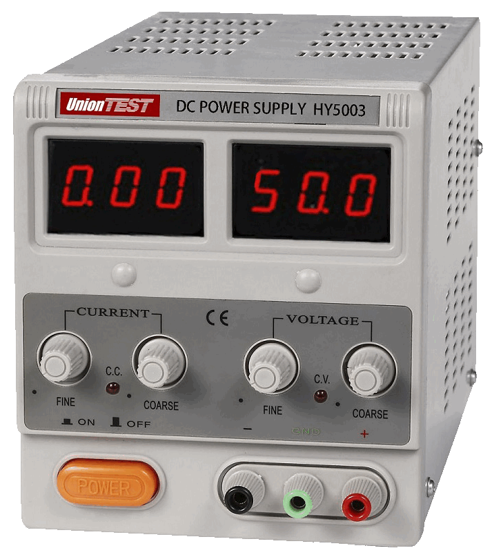 UnionTest HY5003 (прежнее название Mastech HY5003)– источник питания, позволяющий получать регулируемое, точное и стабильное постоянное напряжение или постоянный ток. Две пары регуляторов грубой и точной настройки облегчают установку напряжения и тока, а цифровые светодиодные индикаторы тока и напряжения упрощают считывание параметров выхода.