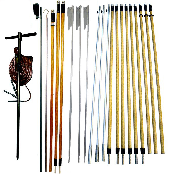 Для заземления проводов в комплекте предусмотряны три 5-и звенные заземляющие штанги с захватами.Каждая заземляющая штанга состоит из металлического звена с захватом , металлического звена, 2-х изолирующих звеньев и одного изолирующего звена с рукояткой.