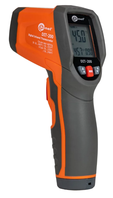 DIT-200 – инфракрасный измеритель температуры (пирометр). Современный прибор, позволяющий бесконтактным методом измерить температуру поверхности любых объектов: электронные компоненты, пластик, металл, дорожные покрытия, пластик, дерево, легко воспламеняемые объекты.