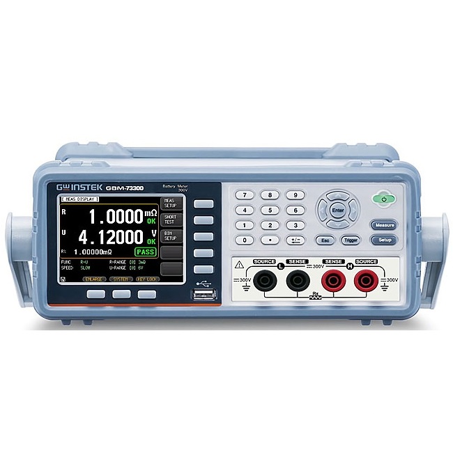 <h2>Особенности тестера батарей GBM-73080:</h2><ul><li>«2 в 1»: измерение внутреннего сопротивления (Rвн) и постоянного напряжения источников питания (V);</li><li>Поддержка всех типов химических источников тока*: батарей и элементов питания, аккумуляторных батарей, а также систем резервного питания пост. напряжения с целью анализа их состояния и оценки уровня заряженности;</li><li>Диапазон измерений Rвн: 0,1 мкОм ... 3200 Ом (7 пределов);</li><li>Диапазон измерений Uпост: 10 мкВ … 80В для GBM-73080 (пределы «±8В», «±80 В»), 10 мкВ … 300 В для GBM-73300 (3 предела: «±8В», «±80 В», «±300»В);</li><li>Макс. разрешение: 0,1 мкОм / 10 мкВ;</li><li>Базовая погрешность: ± 0,5% (R), ± 0,01% (V), 4-х пр. схема измерений;</li><li>Скорость измерения: 3 изм/с, 14 изм/с, 25 изм/с, 65 изм/с;</li><li>Автоматический и ручной выбор предела, установка «0» (Zero);</li><li>Одновременное отображение 2-х параметров: внутреннего сопротивления и пост. напряжения (R + V);</li><li>Режим сравнения (допуск. контроль) при измерении Rвн и напряжения с заданием пределов (Hi/Lo) компарирования (Abs, Per/%, SEQ) с визуальной и звуковой индикацией;</li><li>Функция статистической обработки (Mx+B) на длительном интервале, построение графиков (кривых распределения), режим записи и хранения результатов (до 10.000 отсчетов);</li><li>Отображение статистики в виде таблиц, просмотр нормального распределение напряжения и Rвн экспорт данных на USB-flash;</li><li>Развернутое меню запуска измерений (Trig): внутр., ручной, внешний/ ext и ДУ/remote;</li><li>Детектор плохого контакта «OPEN & WIRE» в цепи измерений при использовании щупов (Разомкнут/ Замкнут);</li><li>Цветной графический дисплей (диагональ 9 см);</li><li>Удержание показаний, усреднение, вывод данных на печать (Print), встроенный календарь (таймер);</li><li>Интерфейсы: RS-232C/ USB, слот HANDLER (сортировщик);</li><li>Гнездо для USB-flash на передней панели (запись/ вызов данных).</li>